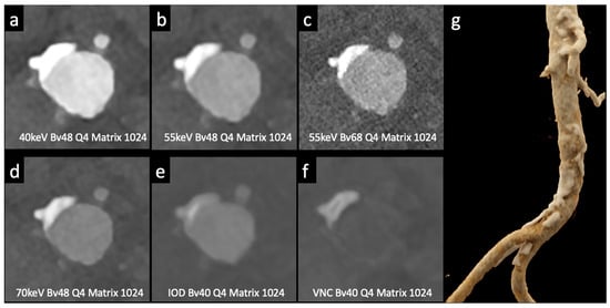 Comparison of image quality with photon-counting CT and standard contrast media. Abdominal aortic lumen with wall calcification axial images. High Resolution images (Matrix 1024 × 1024) with different reconstruction kernels (window level W2000, C700): 40 keV Kernel Bv48, Q4 (a); 55 keV Kernel Bv48, Q4 (b); 55 keV Kernel Bv68, Q4 (c); 70 keV Kernel Bv48, Q4 (d); Iodine map reconstruction, kernel Bv40, Q4 (e); Virtual Non-Contrast VCN reconstruction (f); 3D-Cinematic Rendering of the abdominal aorta (g). Department of Radiology, Fondazione Toscana Gabriele Monasterio, Pisa, Italy.