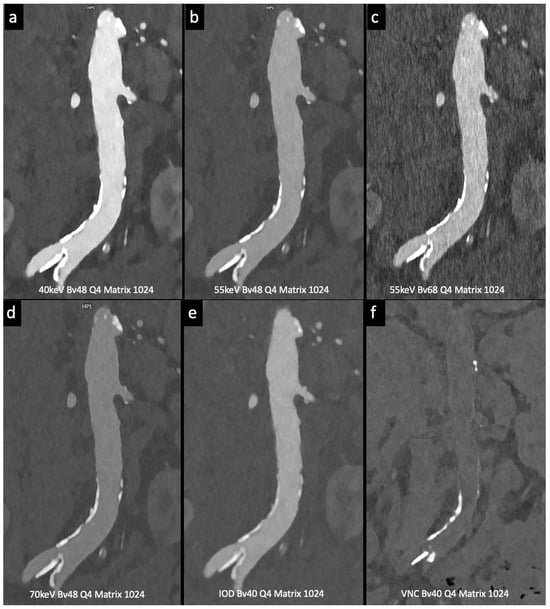 Comparison of image quality with photon-counting CT and standard contrast media. Abdominal aortic lumen with wall calcification coronal images. High Resolution images (Matrix 1024 × 1024) with different reconstruction kernels (window level W2000, C700): 40 keV Kernel Bv48, Q4 (a); 55 keV Kernel Bv48, Q4 (b); 55 keV Kernel Bv68, Q4 (c); 70 keV Kernel Bv48, Q4 (d); Iodine map reconstruction, kernel Bv40, Q4 (e); Virtual Non Contrast VCN reconstruction (f). Department of Radiology, Fondazione Toscana Gabriele Monasterio, Pisa, Italy.
