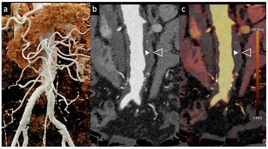 Aortic angiographic evaluation of the abdominal aortic aneurysm evaluated with photon-counting CT and standard contrast media (the same example of Figure 2, coronal view). The aortic wall is indicated between solid and empty arrowhead. 3D-Volume Rendering representation (a); High-Resolution coronal evaluation, 55 keV, Kernel Bv68 Q4 Matrix 1024 (b); Spectral Dual Energy coronal Reconstruction (c). Department of Radiology, Fondazione Toscana Gabriele Monasterio, Pisa, Italy.