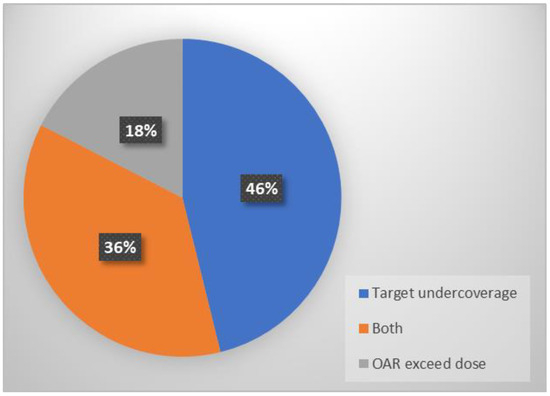 All 195 fractions were delivered using on table-reoptimized treatment plans. The rationale for proceeding with online adaptation was recorded for each fraction based on the evaluation of the target coverage and/or OAR predicted doses exceeding the constraints from the original plan in the new anatomical distribution (structure deformations). As shown in Figure 2, the primary rationale for online adaptation was GTV/PTV undercoverage (46% of all fractions), followed by pre-specified dose constraints for OAR doses exceeding tolerance (18%), or both indications (36%). For the OARs, PBT exceeded the tolerance dose in 112 fractions (57.4%), followed by the esophagus in 108 (55.4%), the spinal cord in 49 (25.1%), the heart in 29 (14.9%), the trachea in 28 (14.4%), the brachial plexus in 20 (10.3%), and normal lungs in 6 fractions (3.1%).