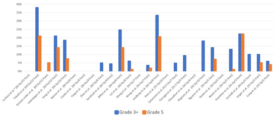 Different hypofractionated schedules have been utilized for ultracentral tumors (Supplementary Table S1) [9,13,14,15,16,17,18,19,20,21,22,23,24,25,26,27,28,29,30,31,32,33,34,35,36,37,38,39,40,41,42,43], but treatment-related toxicities remain concerning (Figure 3) [9,13,14,15,16,17,18,20,21,23,24,25,26,27,28,29,30,31,32,33,34,36,38,40,42,43]. Notably, two prior retrospective series detailed their experience with a more conservative hypofractionation schedule, administering a total of 60 Gy in 12 fractions (5 Gy per fraction), utilizing daily cone-beam computerized tomography (CBCT) for online setup and position verification. Lodeweges et al. reported a 72-patient series and described a grade 3+ toxicity of 21% and a fatal outcome secondary to bronchopulmonary hemorrhage of 14%. All these patients had PTVs overlapping with the PBT. Moreover, autopsies performed on two patients demonstrated bronchi-vascular fistulae. Interestingly, they found an association between the mean BED3 and the main bronchus of ≥91 Gy and an increasing risk of fistualization [33]. Tekatli et al. using this same fractionation schedule (60 Gy/12 fractions; 47 patients), reported a grade 3+ toxicity of 38%, with a grade 5 treatment-related toxicity of 21% (13% due to bronchopulmonary hemorrhage) [18]. In this series, the median maximum doses to the PBT and trachea on the original treatment plans were 63.4 Gy and 41.5 Gy (ranges: 62.5–66.3 Gy and 1–66.9 Gy), respectively. In our series, we adopted a more prolonged hypofractionation schedule, delivering 60 Gy in 15 fractions, which is a departure from the more aggressive regimens in prior studies. Crucially, our treatment methodology involved mid-inspiration breath hold, ensuring alignment between planning constraints and the delivered dose to central OARs. This approach stands in contrast to radiotherapy delivery methods that aim to reduce respiratory excursion, potentially leading to a dose cloud surpassing OAR constraints during treatment.
