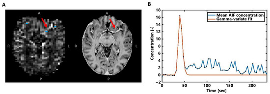 (A) Example of the AIF voxel selection (blue) visualized with the obtained CA concentration map in the same subject as in Figure 1. The MP2RAGE UNI image on the right is shown for better visualization of the middle cerebral artery highlighted by the red arrows. (B) The averaged concentration-time curve of the selected AIF voxels in blue, where the gamma-variate fit is shown in orange.
