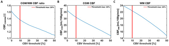 Signal contamination of the remaining largest blood vessels was excluded from the analysis by eliminating voxels with the 10% highest CBV values [30] (Figure 3B,C). To investigate the effect of this specific large vessel exclusion threshold on the CBF results, a sensitivity analysis was performed, whereby the removal of the voxels with the highest 0–50% CBV values, roughly representative of the largest vessels, was taken into account. Mean CBV and CBF values were obtained in the different tissue types using the segmented CGM and WM maps. All analyses were performed using custom-made code developed in MATLAB (R2020a, MathWorks, Natick, MA, USA).