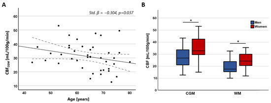 (A) Scatterplots showing the negative relation between CBF in the CGM and age. (B) Boxplots showing higher CBF in women compared to men in both the CGM and WM (* CGM: Std. β = 0.428, p = 0.004; * WM: Std. β = 0.366, p = 0.020).