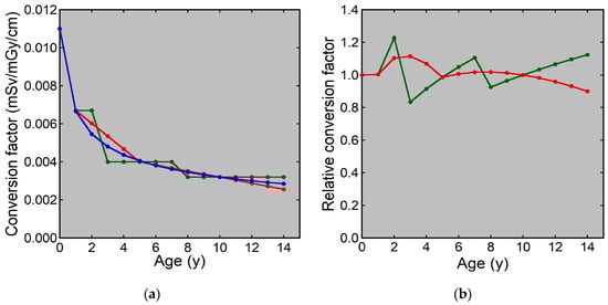 Conversion factors from the DLP to the ED at each age: (a) Conversion factors for the curve (blue), linear (red), and simple (green) methods. (b) The relative conversion factor for the linear (red) and simple (green) methods.