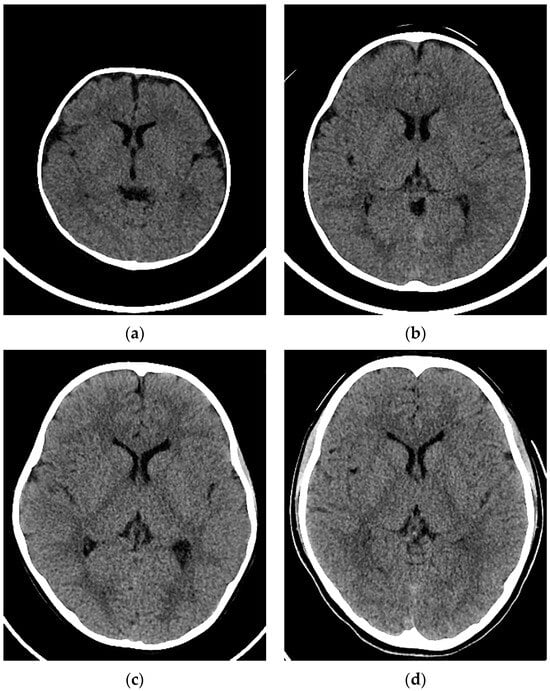 Computed tomography (CT) delivers relatively high radiation doses, and the potentially detrimental effects of CT radiation exposure are a significant concern in modern medicine [1]. Evaluation of brain abnormalities is the most common indication of CT in children [2,3,4]. In the dose survey for pediatric CT in the USA, 52.6% of the analyzed examinations were brain CT excluding the scans of the sinus and maxillofacial area (4.3%, 2.8%, 7.0%, and 38.5% for 0, 1, 2–5, and 6–18 years, respectively) [3]. Children are radiosensitive, and their long life expectancies allow cancer to develop after a long latency period [5]. Epidemiological studies have demonstrated an increased incidence of brain tumors in children who have undergone brain CT [6,7,8,9]. Therefore, radiation dose management and optimization are essential for pediatric brain CT.