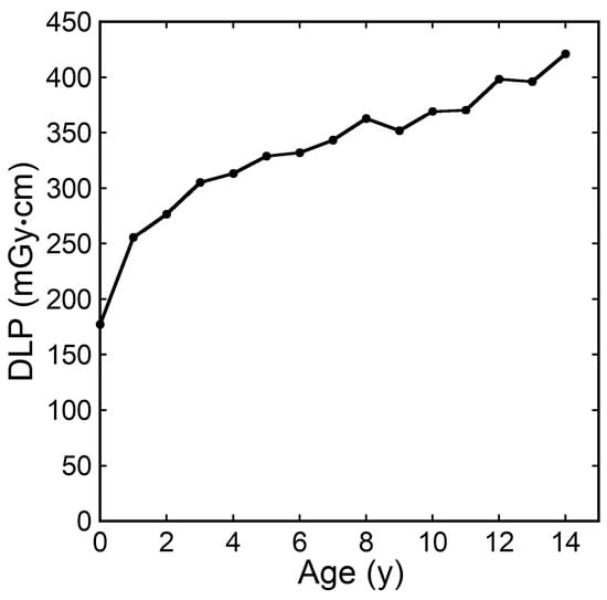 Examples of CT images at 0, 1, 5, and 10 years are presented in Figure 2. The median DLP at each age in integer years was lowest at 0 years and increased with age (Figure 3). The annual increase was relatively large between 0 and 1 years. In contrast, the median ED estimated by the curve method was highest at 0 years and decreased with age (Figure 4). The annual decrease was relatively large between 0 and 1 years and between 1 and 2 years. After that, the median ED decreased slowly and remained almost constant after 9 years. The median ED estimated by the linear method also decreased consistently with age. However, the ED–age profile appeared mildly deformed, creating a shoulder, at 2 and 3 years. The relationship between age and ED was complicated for the simple method. The median ED was high at 0, 1, and 2 years and decreased suddenly at 3 years. After that, it increased slowly up to 7 years, and then it decreased again at 8 years, followed by a slow increase. The median ED obtained by the Radimetrics method tended to decrease with age, but there were obvious up-and-down changes.