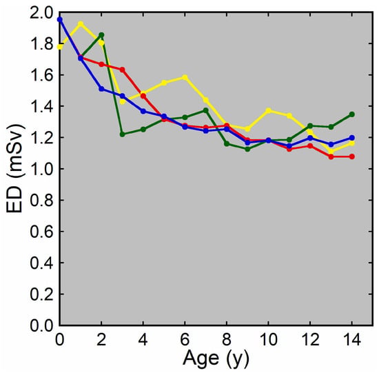 Unlike the curve method, the conversion factor for estimating the ED at each age may be selected from the four conversion factors provided by the ICRP, as in the simple method in this study. We used the value provided for the closest age, and the ICRP conversion factors at 0, 1, 5, and 10 years were applied to estimate the ED by the simple method in children aged 0, 1–2, 3–7, and 8–14 years, respectively. Actually, an appropriate conversion factor should decrease each year. The simple method is expected to overestimate the ED at 2 years because the conversion factor for a 1-year-old is applied to a 2-year-old child, and to underestimate the ED at 3 years because the conversion factor for a 5-year-old is applied to a 3-year-old child. The median ED estimated by the simple method showed complicated, unreasonable changes with age, suggesting limitations of the method.
