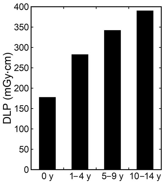 In addition to analysis for each age, analysis was performed for the 0-, 1–4-, 5–9-, and 10–14-year age groups. The median values of the DLP and the EDs estimated by the four methods for each age group are presented in Figure 5 and Figure 6, respectively. The median DLP was higher and the median EDs were lower in the older groups than in the younger groups. The median ED estimated by the curve method differed to a large extent between the 0- and 1–4-year groups and between the 1–4- and 5–9-year groups, and to a small extent between the 5–9- and 10–14-year groups. The median EDs estimated by the Radimetrics method differed from those estimated by the other three methods. The differences between the curve and linear methods and between the curve and simple methods tended to be smaller.