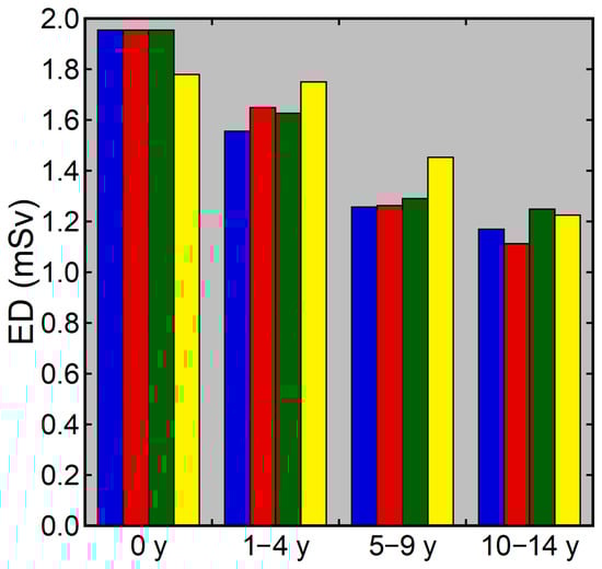 Median ED for each age group. The blue, red, green, and yellow bars represent EDs estimated by the curve method, linear method, simple method, and Radimetrics method, respectively.
