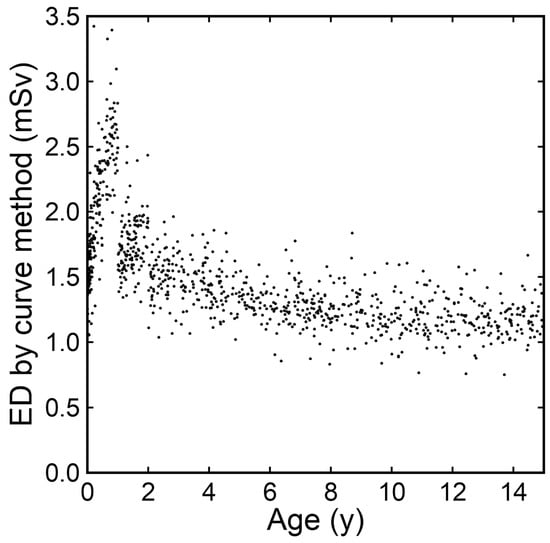 When the ED estimated by the curve method for each scan was plotted against age in actual number of years, the ED was relatively low immediately after birth and increased up to the age of 1 year (Figure 7). After that, the ED decreased and then plateaued.
