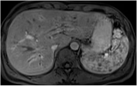 The use of hepatospecific GBCA and dynamic T1w sequences, including the hepatospecific phase, allows for the visualization of local or diffuse impairments of liver parenchyma and alterations in the contrast excretion in central bile ducts []. In patients with PSC, the excretion of hepatospecific GBCA is often delayed compared to healthy controls and correlates with hepatic function, as estimated by bilirubin levels [].