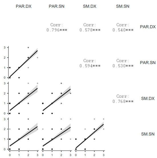 Correlation matrix plot of SGUS scores among glands. PAR = parotid gland, SM = submandibular gland, DX = right, SN = left. *** = p < 0.001.