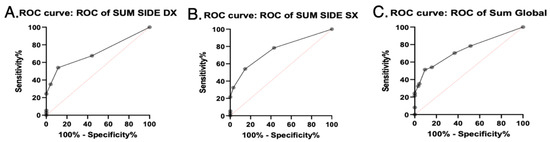 SGUS AUROC curves. Area under ROC curves of SGUS scores with clinical relevance. (A) Sum side DX = sum of SGUS scores of right parotid and submandibular glands. (B) Sum side SX = sum of SGUS scores of left parotid and submandibular glands. (C) Sum global = sum of SGUS scores of all four glands.