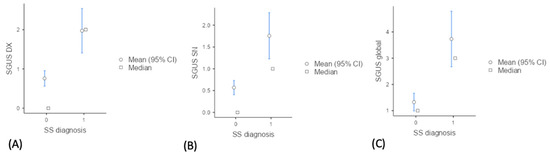 Descriptive plots of mean SGUS scores in SS vs. non-SS. (A) Distribution of SGUS scores for the right parotid and submandibular glands (SGUS DX), (B) left parotid and submandibular glands (SGUS SN) (C) and the sum of all four glands (SGUS global) between SS (primary Sjogren syndrome) and non-SS groups.
