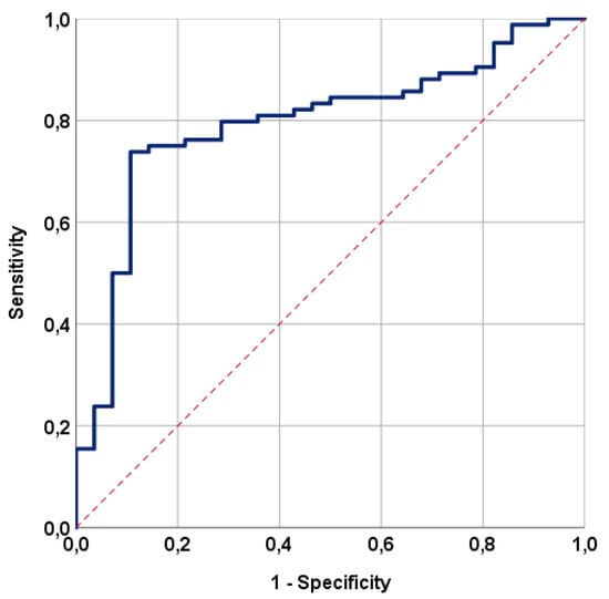 The outcomes of a receiver operating characteristic (ROC) curve analysis examining the correlation between the pre-treatment total masseter muscle volume and radiation-induced trismus rates following concurrent chemoradiotherapy [area under the curve (AUC): 79.5%; sensitivity: 75.0%; specificity: 78.6%; Youden index: 0.536].