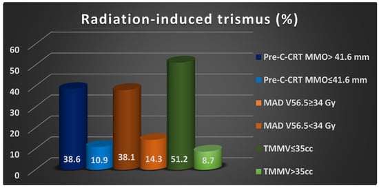 The bar chart depicting the rates of radiation-induced trismus rates per factor demonstrated independent significance in multivariate analyses. Abbreviations: C-CRT; concurrent chemoradiotherapy, MMO; maximum mouth opening, MAD; masticatory apparatus dose, V; volume, TMMV; total masseter muscle volume, cc; cubic centimeter.