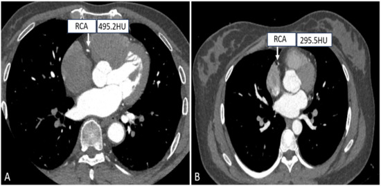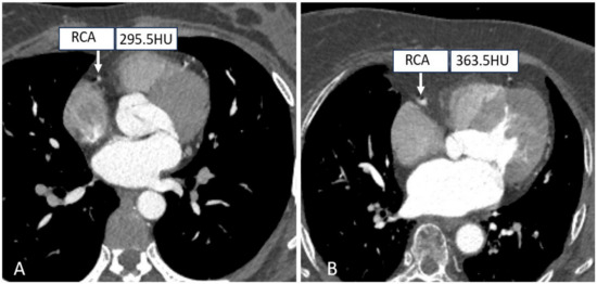 Right coronary CTA images with different tube voltages. ((A) A patient with a tube voltage of 100 kV; (B A patient with a tube voltage of 120 kV.).