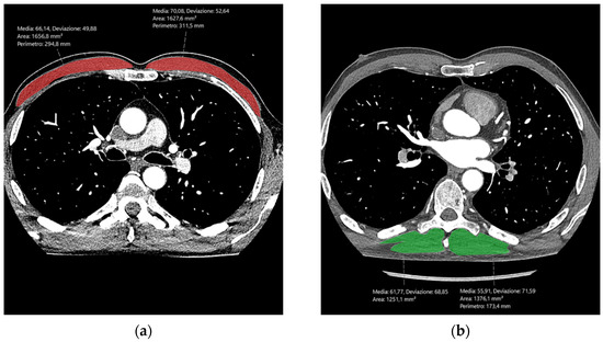 Example of the segmentation of the pectoralis major muscles at the T6 level (red areas, (a)) and paravertebral skeletal muscle at the T8 level (green areas, (b)). For each muscle, the mean attenuation in Hounsfield units and the cross-sectional area (CSA) were measured.