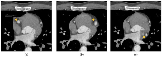 Example of the pericoronary adipose tissue segmentation on the post-contrast CCTA images. The regions of interest (ROIs—orange circles) are placed in the pCAT surrounding the right coronary artery (a), the left anterior descending artery (b), and circumflex artery (c).
