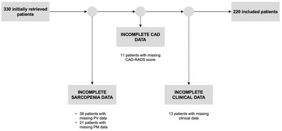 Starting from 303 patients initially retrieved, who had undergone CCTA at our institution between January and April 2023, 38 were excluded due to missing PV data, 21 due to missing PM data, 11 were excluded as the CAD-RADS score was not computable due to CCTA artifacts, and 13 presented with incomplete clinical data. Eventually, this led to 220 included patients, 132 (60%) of whom were males, with a median age of 65 years (IQR 58–72 years). A flowchart depicting the patient selection process is shown in Figure 3.