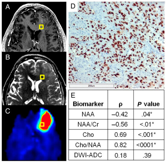 A normalized metric of tumor infiltration, Sox2 density, identifies tumors outside of conventional imaging and exhibits striking correlations with sMRI biomarkers. Though no obvious abnormality can be found on preoperative T1w-CE (A) or T2w imaging (B) in this patient, a striking elevation in Cho/NAA (C) on sMRI suggests substantial tumor infiltration. (D) A light micrograph of tissue (including a 200 μm scale bar) from the gold box showed elevations in Sox2 density along with the microvascular proliferation and nuclear atypia suggestive of GBM. (E) Statistically significant correlations were seen between various normalized metabolic markers and Sox2 density, with Cho/NAA exhibiting the strongest association. * Significant at p < 0.05. DWI-ADC, diffusion-weighted image–apparent diffusion coefficient. Originally published in the following reference [7].