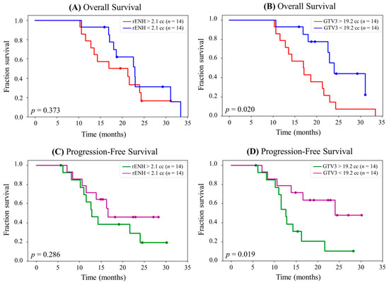 (A) Kaplan–Meier survival curve for overall survival (OS) stratified into equal groups by the median residual contrast-enhancing (rENH) tumor volume (2.1 cc). The median OS for patients with rENH > 2.1 cc is 21.3 months, and the median for OS for patients with rENH < 2.1 cc is 23.0 months. Of note, the assessment only included 28 of 30 patients from the study (2 were excluded due to harboring IDH1 mutation) (B) Kaplan–Meier survival curve for OS stratified into equal groups by the median gross tumor volume 3 (GTV3) (19.2 cc). The median OS for patients with GTV3 > 19.2 cc is 17.1 months, and the median OS for patients with GTV3 < 19.2 cc is 27.4 months. (C) Kaplan–Meier survival curve for progression-free survival (PFS) stratified into equal groups by the median rENH tumor volume (2.1 cc). The median PFS for patients with rENH > 2.1 cc is 12.8 months, and the median PFS for patients with rENH < 2.1 cc is 19.0 months. (D) Kaplan–Meier survival curve for PFS stratified into equal groups by the median GTV3 (19.2 cc). The median PFS for patients with GTV3 > 19.2 cc is 12.6 months, and the median PFS for patients with GTV3 < 19.2 cc is 24.0 months. Originally published in the following reference [60].