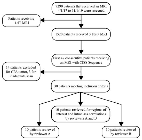 Patients who underwent an MRI of the skull base at the Johns Hopkins Hospital between 1 April 2017, and 1 November 2019 were screened for axial CISS sequences. A query was performed for MRI scans of the brain with and without intravenous contrast in one location in the adult hospital. The query returned 7290 scans. The scans were then filtered for those performed using the same 3 Tesla scanner (Siemens Magnetom Skyra, Forchheim, Germany, n = 1521 scans). Scans were excluded if the patient was under 18 years of age and if the images did not fully include the eyes and inner ears. Additionally, patients were screened for cerebellopontine angle tumors and diseases of the eye potentially leading to magnetic field disturbances. Patients with cerebellopontine angle or inner ear tumors, ocular pathologies secondary to cranial pathologies (e.g., pituitary adenoma causing visual field defects), or systemic diseases, such as diabetes mellitus causing diabetic retinopathy, were excluded. The first 30 consecutive patients who underwent a skull-base protocol that included higher resolution (0.6 mm isometric voxels) CISS sequences and who met the above criteria were selected for further analysis. A flow chart for the included data is shown in Figure 1. This retrospective study was approved by the Institutional Review Board of Johns Hopkins University School of Medicine as project number IRB00279939. Informed consent was waived due to the retrospective nature of this study.