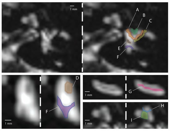 Regions of interest in the inner ear. (A) Arc around the lateral semicircular canal; (B) Indentation in the anterior region of the lateral semicircular canal; (C) Diagonal region across the lateral semicircular canal; (D) Ellipsoid shape in the lateral vestibular region; (E) Pentagon-shaped structure in the center of the vestibulum; (F) “Y”-shaped figure in the posterior vestibular region; (G) Linear strip along the turn of the cochlea; (H) “V”-shaped region at the top of the cochlea; (I) Region in the central cochlea.