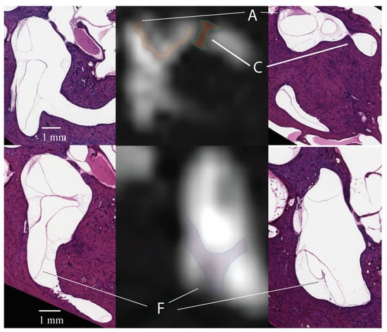 Signal loss in the vestibular region was seen frequently in areas of the “Y”-shaped figure in the posterior vestibule (region F, 96.7%), within the pentagon-shaped structure in the center of the vestibule (region E, 90%), and the arc around the lateral semicircular canal (region A, 91.7%) (Table 3). A diagonal region across the lateral semicircular canal was seen only in 38.5% of ears (C). When compared to the histology, the indentation in the anterior wall of the lateral semicircular canal (region B) corresponded to the cristae of the lateral semicircular canal, and the ellipsoid region in the lateral vestibule corresponded to the utricle (region D). The infrequent diagonal region (C) corresponded to a bony narrowing just lateral to the ampullae of the lateral semicircular canal (Figure 4). The pentagon-shaped region, E, the “Y”-shaped figure in the posterior vestibule, F, and a portion of the arc around the lateral semicircular canal, A, were identified consistently. These areas may represent portions of the membranous utricle seen in histology. There were no areas within the vestibule that could not be accounted for by inner ear anatomy.