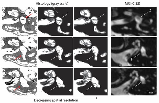 Creating a virtual MRI using histology. To show signal averaging, 2-D grayscale sections from temporal bone histopathology are down-sampled to 80 × 80 and 40 × 40-pixel grids. Bone and air were colored black to represent the expected signal from MRI, the fluid was kept white, and soft tissue of the inner ear and internal auditory canal was maintained from histology. CISS MRI is shown in similar slices. Arrows indicate the utricular macula (upper panel, object D on MRI), the anterior (middle panel, object F on MRI), and the posterior walls of the membranous utricle (lower panel, object F on MRI). Note: The example is a 2-D average. MRI averages signals in 3-D, further reducing the sharpness of the small structures when averaging [].