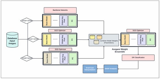 This study introduces a hybrid deep learning ensemble system designed for the automated diagnosis of different stages of DR. To capture prominent features from multiple retinal lesions depicted in fundus images, we pioneer the use of transfer learning. This novel approach involves amalgamating weights from various models into a unified model, thereby harnessing a diverse array of features and characteristics previously unexplored in this context. In a pioneering methodology unique to this study, a cloned model effectively harnesses averaged weights derived from the training phase. This innovative approach generates distinct features, which are subsequently channeled into a bespoke classifier tailored for evaluating the severity levels of DR. Additionally, we use SHapley Additive exPlanations (SHAP) analysis [19,20] approaches to examine the characteristics that contributed to the results of our prediction models. Each SHAP value defines how much each feature (the region of an image) contributes positively and negatively to the goal prediction in the context of image processing and general ML progress. In a pioneering approach, this study leverages the SHAP methodology, which calculates the local feature importance for each image within the dataset. Unlike existing feature-analysis methods that gauge the extent of features, SHAP assigns a significance value to each feature for a specific prediction. This innovative methodology aims to address the inconsistencies prevalent in current feature importance strategies, mitigating the potential misunderstandings arising from these inconsistencies [14] with synthetics [21]. Notably, the fundus images in this research underwent SHAP analysis, marking a novel utilization of this technique to identify areas manifesting DR’s presence or various stages, delineating the severity of the disease.