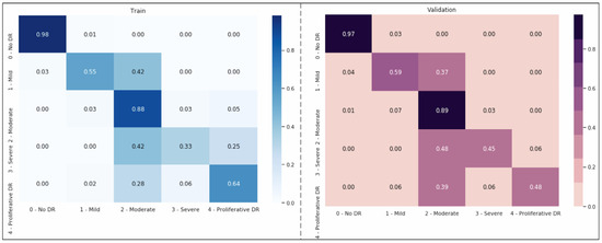 Using the Kaggle dataset, we trained the EfficientNet-B3 model for DR severity assessment. Only two studies [11,48] that we are aware of have employed EfficientNets for the DR classification task. Using progressive scaling, they attained a quadratic weighted Kappa score of ~0.8 overall and an accuracy of ~0.85 during training. In contrast, our approach, which uses EfficientNet-B3 and RGB visuals, which have a complicated architecture and additional parameters, was more accurate than the first predictions, with a quadratic weighted Kappa score of 0.87 (Figure 4).