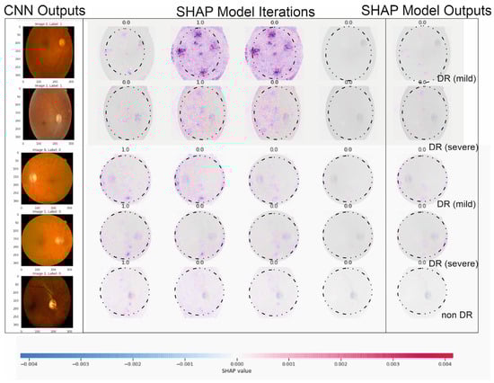 The illustration above describes five outputs in Figure 1 (our five DR levels: 0–5) for extreme values at the edge of SHAP matrixes and random retinopathy images in DR detection zones.