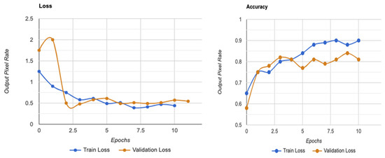 One of the most successful iteration sets was formed by Wang and Yang [49], who used the EfficientNet-B7 model to find referable and vision-threatening DR; Grad-CAM output with finely detailed visualizations demonstrated that their model only recorded DR lesions and did not account for optic discs for prediction. Our methodology demonstrated that EfficientNet, with limited parameters, included all parts of the eye and achieved a high score for DR classification. Moreover, it is seen that the images are determined as DR points as a result of not filtering the DR points before data processing, and the ROC value increases with these apparent images, as shown in the model loss graph of the trained dataset given in Figure 7.