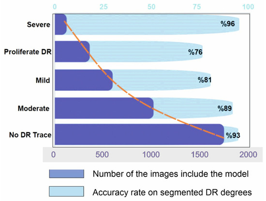 Bodapati et al. [48] employed a deep neural network and a gated attention technique to identify DR using the Kaggle dataset and detect DR points on pre-trained CNN models. One of the most negative handicaps of the method is that spatial pooling techniques are given for obtaining the condensed forms of these representations with data loss. They achieved 97.82% accuracy among more than 3500 total images, and used ~70% for overall training and less than ~20% (about 700 images) for testing. The low inclusion of such data in the system will cause important and detectable DR points to be missed. Similarly, Alyoubi et al. [50] developed a customized CNN model with five convolutional layers and achieved an overall accuracy of 77%. It can be seen that the proposed model performs better than the existing models for the multi-class classification (five classes).