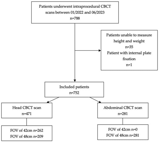 Finally, a total of 752 patients were included in the study, comprising 461 males (61.3%) and 291 females (38.7%). Among these, 471 (62.6%) underwent a CBCT scan of the head (262 of whom were scanned using an FOV of 42 cm, and 209 were scanned using an FOV of 48 cm), and 281 (37.4%) underwent a CBCT scan of the abdomen (all of whom were scanned using an FOV of 48 cm). The age was 61.9 ± 11.6 years, and the BMI was 23.5 ± 3.5 kg·m−2.