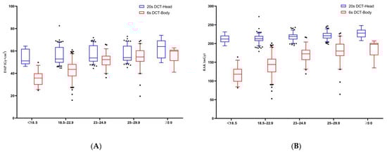 Most variables did not have a Gaussian distribution. Therefore, the values are expressed as medians (25th–75th percentile). For a single abdominal CBCT scan, the DAP was 47.4 (39.6–54.3) Gy⋅cm2, and the RAK was 156 (130.5–179) mGy. Conversely, for a single head CBCT scan, the DAP was 53.8 (50.5–64.4) Gy⋅cm2, and the RAK was 218 (210–224) mGy; these values are 1.1 times and 1.4 times higher, respectively, than those for the abdominal scan. The effects of predictive factors were analyzed and are summarized in Table 2, Table 3, Table 4 and Table 5. Significant increases in both DAP and RAK were observed across increasing BMI categories for all patients (p-value < 0.01 for both) (Figure 2). Compared to the patients with a BMI < 18.5, those with a BMI ≥ 30 demonstrated a 1.7-fold increase in DAP for abdominal CBCT (59.9 versus 35.8 Gy⋅cm2) and a 1.3-fold increase for head CBCT (63.9 versus 50.8 Gy⋅cm2). Additionally, male patients exhibited higher DAP and RAK values in both abdominal and head CBCT scans compared to female patients (p-value < 0.001 for both) (Table 2). Notably, when comparing the FOV 48 cm group to the FOV 42 cm group in terms of head CBCT, there was an increase in DAP but a decrease in RAK (p-value < 0.001) (Table 3).