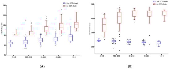 (A) Median tube voltage showed a stepwise increase across increasing BMI categories in the head and abdominal CBCT scans; (B) median tube current showed a stepwise increase in abdominal CBCT scans and a stepwise decrease in head CBCT scans across increasing BMI categories. The plot shows the interquartile range (box), 5th and 95th percentiles (outermost bars), and median (horizontal bar) of the dose distribution in each group.