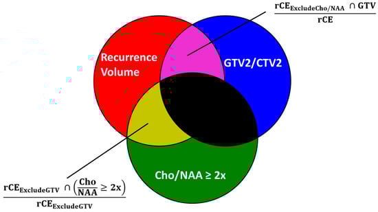Using the rCEExcludeGTV volume, we calculated the overlap percentage with the pre-RT Cho/NAA ≥ 2x volume to determine the percentage of recurred voxels outside of high-dose radiation targets derived from standard imaging, which fall within pre-radiation Cho/NAA ≥ 2x targets. Using the rCEExcludeCho/NAA volume, we calculated the overlap with the GTV2/CTV2 volume to determine the percentage of voxels that recurred within the high-dose radiation target but outside of the pre-radiation Cho/NAA ≥ 2x target. The equation for both calculations is shown below. See Figure 1 for a graphical depiction.