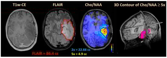 - Pirzkall, A.; Li, X.; Oh, J.; Chang, S.; Berger, M.S.; Larson, D.A.; Verhey, L.J.; Dillon, W.P.; Nelson, S.J. 3D MRSI for resected high-grade gliomas before RT: Tumor extent according to metabolic activity in relation to MRI. Int. J. Radiat. Oncol. Biol. Phys. 2004, 59, 126–137. [Google Scholar] [CrossRef]
