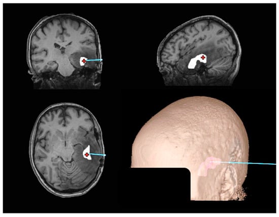 Medtronic S8 Stealth® Navigation Tool (Medtronic, Minneapolis, MN, USA) with the 5x Cho/NAA biopsy target displayed. The entry point coordinate was (72, 15, −14), and the target point, depicted by the red crosshair, was at coordinates (36, 12, −15) in the MRI DICOM space. The total travel distance was 36.1 mm to reach the target volume. The blue line shows the projected travel of the needle. The patient’s face is obscured for anonymity.