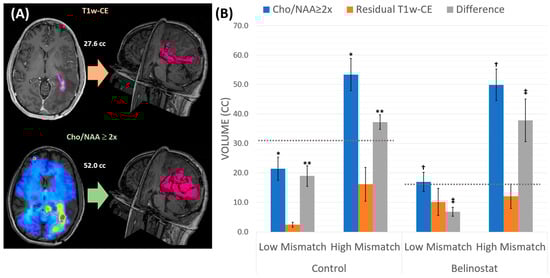 (A) A representative patient from the belinostat cohort in the High-Mismatch subgroup displaying the vast difference in the T1w-CE-derived volume (purple outline top) compared to the Cho/NAA ≥ 2x volume (purple outline bottom). (B) This graph displays the average Cho/NAA volume (blue), residual T1w-CE volume (orange), and the difference between the two (gray). The dotted gray line in each of the cohort clustered bar graphs shows the median difference value that created the Low- and High-Mismatch groups. For the control cohort, the median difference was 31.1 cc, while in the belinostat cohort, it was 16.1 cc. *, **, †, and ‡ indicate significance between groups.