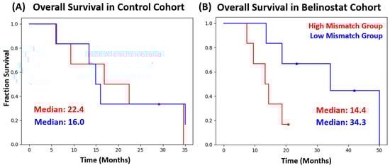 Figure 5 shows the OS for both the control and belinostat cohort, each split into their respective High-Mismatch and Low-Mismatch subgroups. There was no significant difference in the control cohort between the High-Mismatch (median OS: 22.4 months) and the Low-Mismatch (median OS: 16.0 months) subgroups (p = 0.82). In the belinostat cohort, the median OS for the High-Mismatch group and the Low-Mismatch group was 14.4 and 34.3 months, respectively, with the difference approaching statistical significance (p = 0.07). The Kaplan–Meier curves for the belinostat cohort did not have any cross-over between the two subgroups.