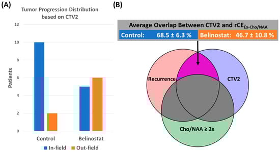 (A) This figure quantifies the number of patients with rCEEx-Cho/NAA and CTV2 percent overlap greater than 50% as in-field (blue) and those with less than 50% as out-field progression (orange). The control cohort had a majority of patients with in-field progression (10/12) compared to the belinostat cohort, which only had 5/11. (B) Graphical representation of the overlap (purple) being quantified with average overlap percent values for the control and belinostat cohorts.
