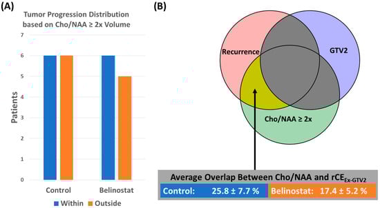 In Figure 6, we show the number of patients quantified as in-field (rCEEx-Cho/NAA and CTV2 Overlap > 50%) or out-field (rCEEx-Cho/NAA and CTV2 Overlap < 50%) for each cohort. We found that in the control cohort, there were a majority (10/12) of patients with in-field progression, while the belinostat cohort had a majority of patients (6/11) with out-field progression. The average rCEEx-Cho/NAA and CTV2 percent overlap in the belinostat and control group was 46.7 ± 10.8% and 68.5 ± 6.3%, respectively, and the difference between the groups approached significance (p = 0.06).