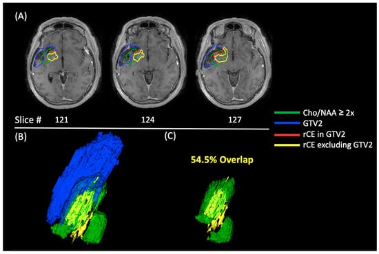 A representative case from the belinostat High-Mismatch group with recurrence overlap analysis using GTV2. (A) An axial view of the GTV2 (blue), pre-RT Cho/NAA ≥ 2x, and rCE excluded from GTV2 (yellow) and rCE within the GTV2 (red) These images were acquired 3 months after the progression date. (B) 3D images of the rCE volume excluding GTV2 (yellow), the pre-RT Cho/NAA ≥ 2x (green), and the GTV2 (blue). (C) 3D images of the rCE excluded from GTV2 (yellow) and pre-RT Cho/NAA ≥ 2x (green) without the GTV2 displaying the 54.5% overlap between the two volumes.
