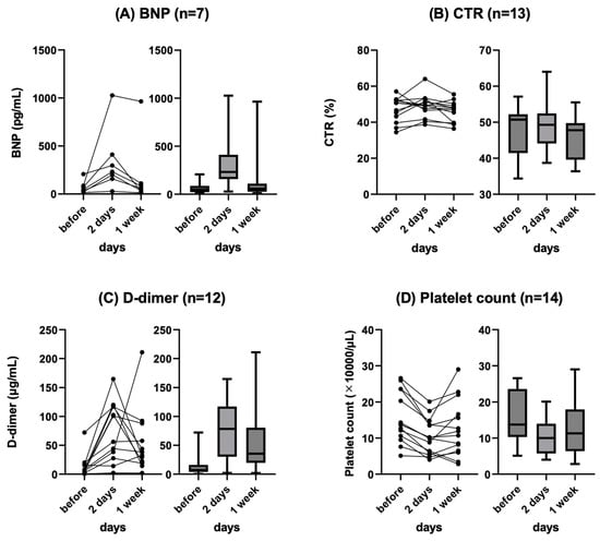 Changes in BNP (A), CTR (B), D-dimer (C), and platelet (D) at baseline, 2 days, and 1 week after PVS placement. Line chart (left) and box plots (right) are shown. BNP: brain natriuretic peptide, CTR: cardiothoracic ratio, PVS: peritoneovenous shunt.