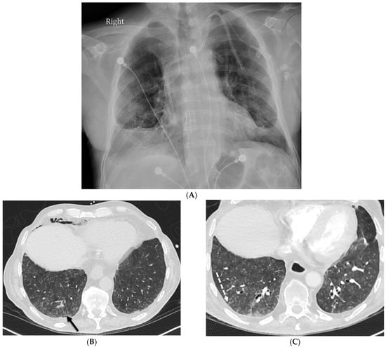 A 68-year-old male with a history of idiopathic pulmonary fibrosis underwent bilateral lung transplantation and now presents with shortness of breath and hypoxia five months later. Bronchoscopy revealed adenovirus infection. The frontal chest on the right in (A) demonstrates interstitial prominence. Axial chest CT images (B,C) reveal tree-in-bud opacities (dashed white arrow) in both lower lobes and smooth interlobular septal thickening (solid black arrow).