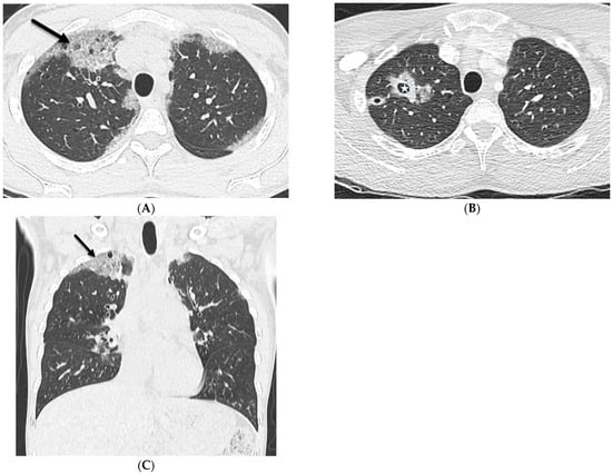 - Fujimoto, Y.; Nomura, K.; Shimizu, D.; Okuda, T.; Yoshida, N.; Matsumoto, Y.; Taki, T.; Horiike, S.; Taniwaki, M. Pulmonary relapse of non-Hodgkin’s lymphoma in bilateral upper lobes. Intern. Med. 2006, 45, 971–973. [Google Scholar] [CrossRef] [PubMed][Green Version]